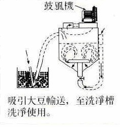 如上圖所示,高壓風(fēng)機(jī)里的葉輪極速運(yùn)轉(zhuǎn),使機(jī)器內(nèi)部抽成真空,風(fēng)機(jī)負(fù)壓增強(qiáng),高負(fù)壓使其產(chǎn)生強(qiáng)大的吸力,將高壓風(fēng)機(jī)組裝在清洗槽的上方,利用高壓風(fēng)機(jī)將清洗槽的空氣迅速抽離,使清洗槽形成真空狀態(tài),將管道連接大豆槽,風(fēng)機(jī)吸力通過管道將大豆吸到清洗槽里進(jìn)行清洗,清洗過后的大豆與水從下面的漏斗排出清洗槽進(jìn)行過濾,將水過濾掉后,再使用高壓風(fēng)機(jī)進(jìn)行烘干,就如同烘手機(jī)的原理一樣,高壓風(fēng)機(jī)的排風(fēng)力大將大豆表面的水跡迅速吹干,這樣即提高了效率,也節(jié)省了時(shí)間。